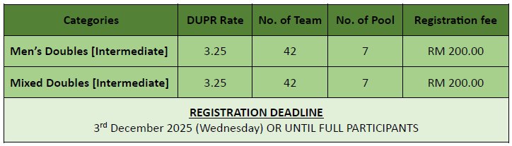 - 💰 Total Prize Pool: RM 9,676 consists of Cash + Medal + ZOCKER paddle + The Kitch’n Club Court Credit Voucher (T&C applied)
