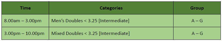 - DUPR rating: below 3.25 (DUPR 3.25 includes all ratings up to 3.299)