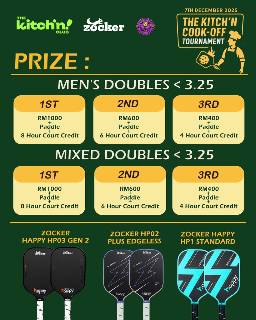 - 💰 Total Prize Pool: RM 9,676 consists of Cash + Medal + ZOCKER paddle + The Kitch’n Club Court Credit Voucher (T&C applied)
