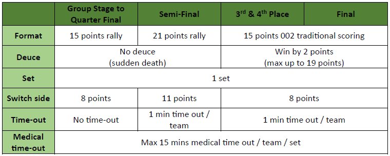 - Players may challenge paddle legality with the Head Referee or Tournament Director before or during a match, but decisions will not affect completed matches.